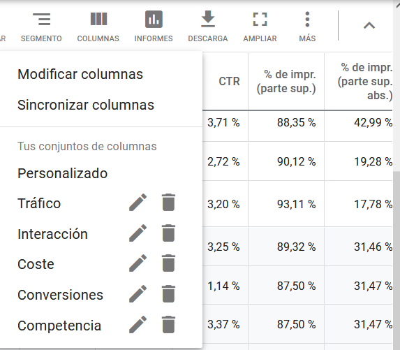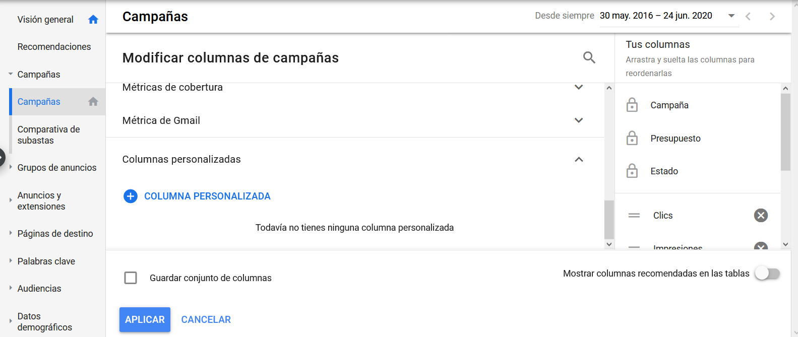 Ahora vamos con una breve explicación sobre cómo crear las columnas personalizadas en Google Ads: