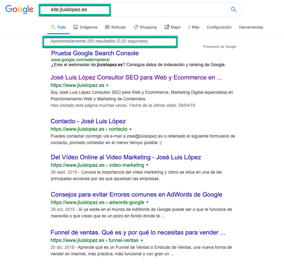 Desde el propio buscador de Google puedes ver tus URLs indexadas con el comando site:tuweb.com