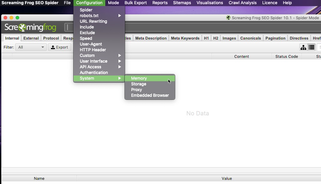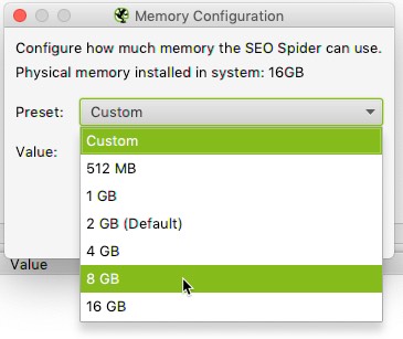 La configuración predeterminada para máquinas de 32 bits es 1 GB de RAM y 2 GB de RAM para máquinas de 64 bits. Recomiendo usar 8GB mínimo, lo que permite a Screaming Frog rastrear hasta 5 millones de URL. Screaming Frog recomienda usar 2GB menos que la RAM total, pero ten cuidado si dedicas la RAM total ya que tu equipo se puede quedar bloqueado.