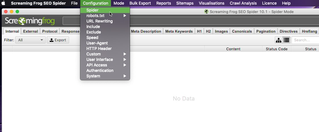 Estas son las configuraciones predeterminadas que Screaming Frog tiene para cada rastreo. Es un buen hábito establecer sus configuraciones específicas para el rastreo que está a punto de ejecutar y hacer ajustes aquí.
