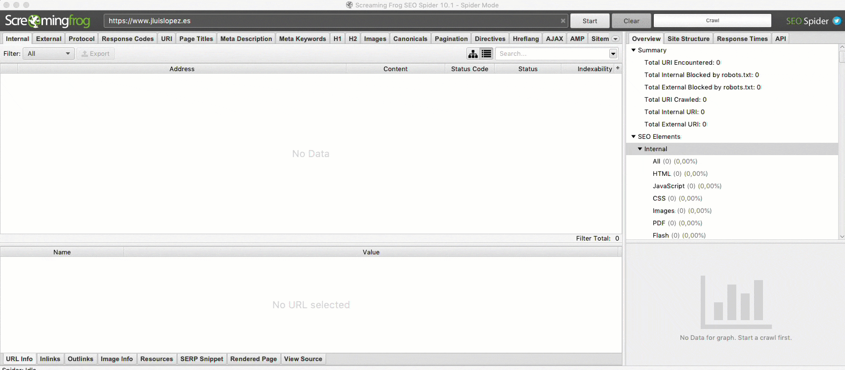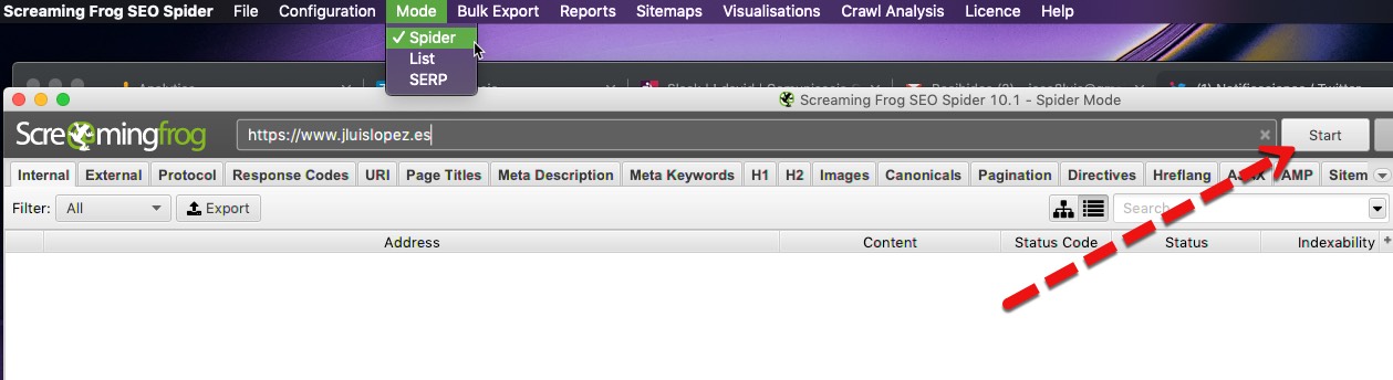 Para rastrear un sitio web, deberás usar el modo «Spider» predeterminado de Screaming Frog. Esto nos permitirá rastrear el sitio y recopilar enlaces basados en nuestras configuraciones y filtros que creamos. Para nuestro ejemplo, rastrearemos https://www.jluislopez.es .