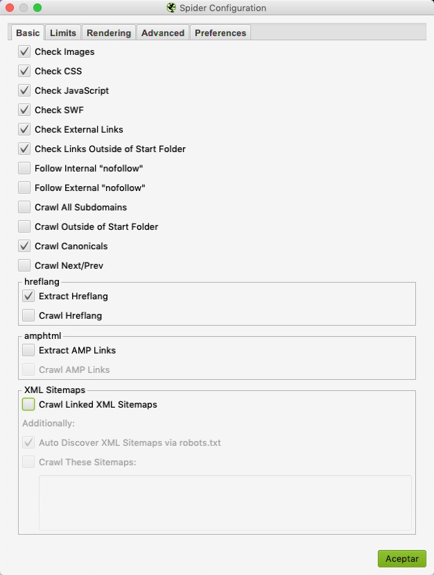 Estas son las configuraciones básicas que uso para ejecutar mis auditorías técnicas: